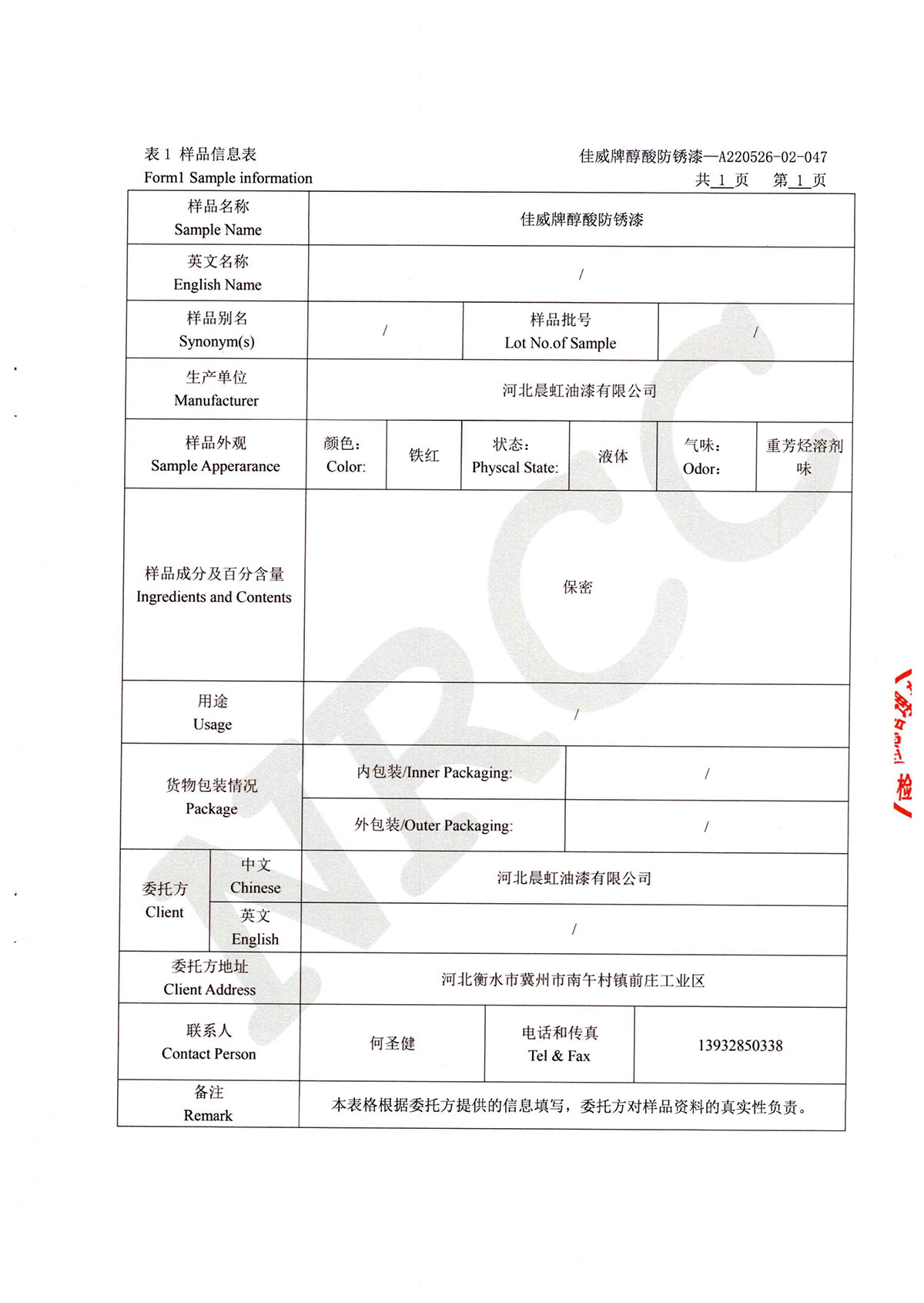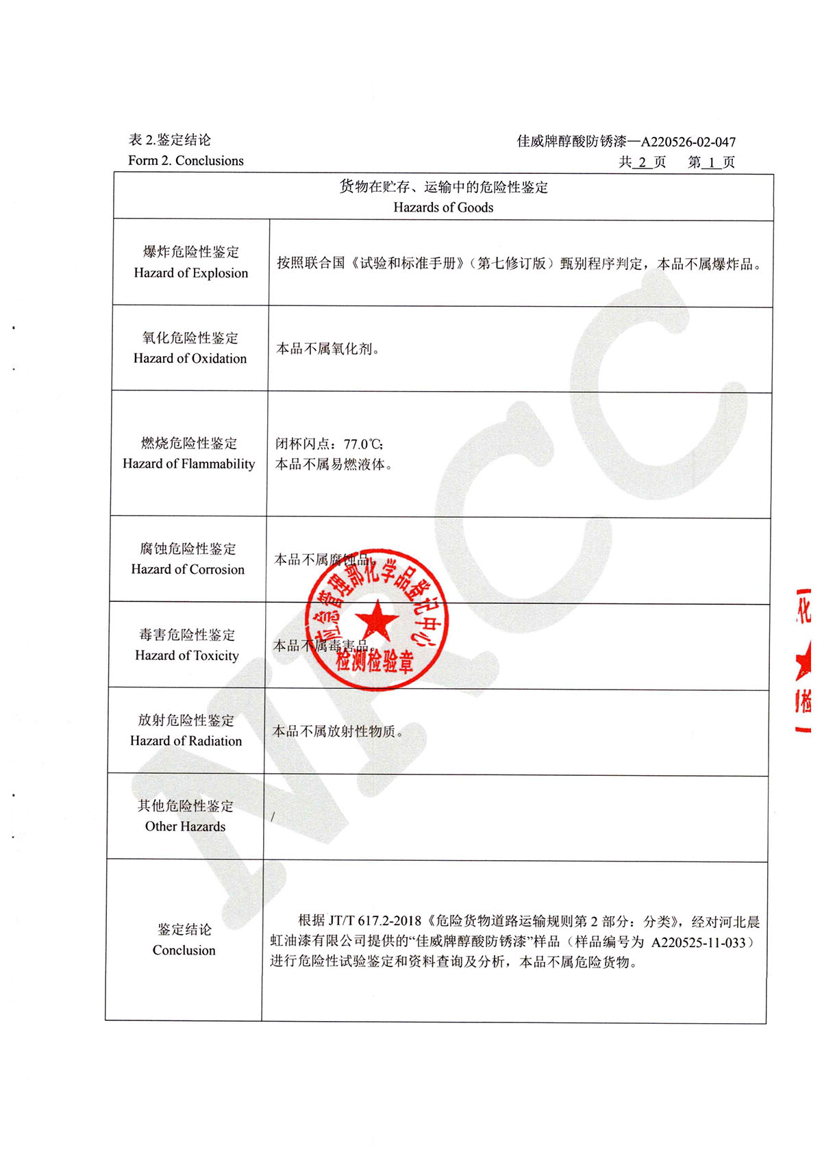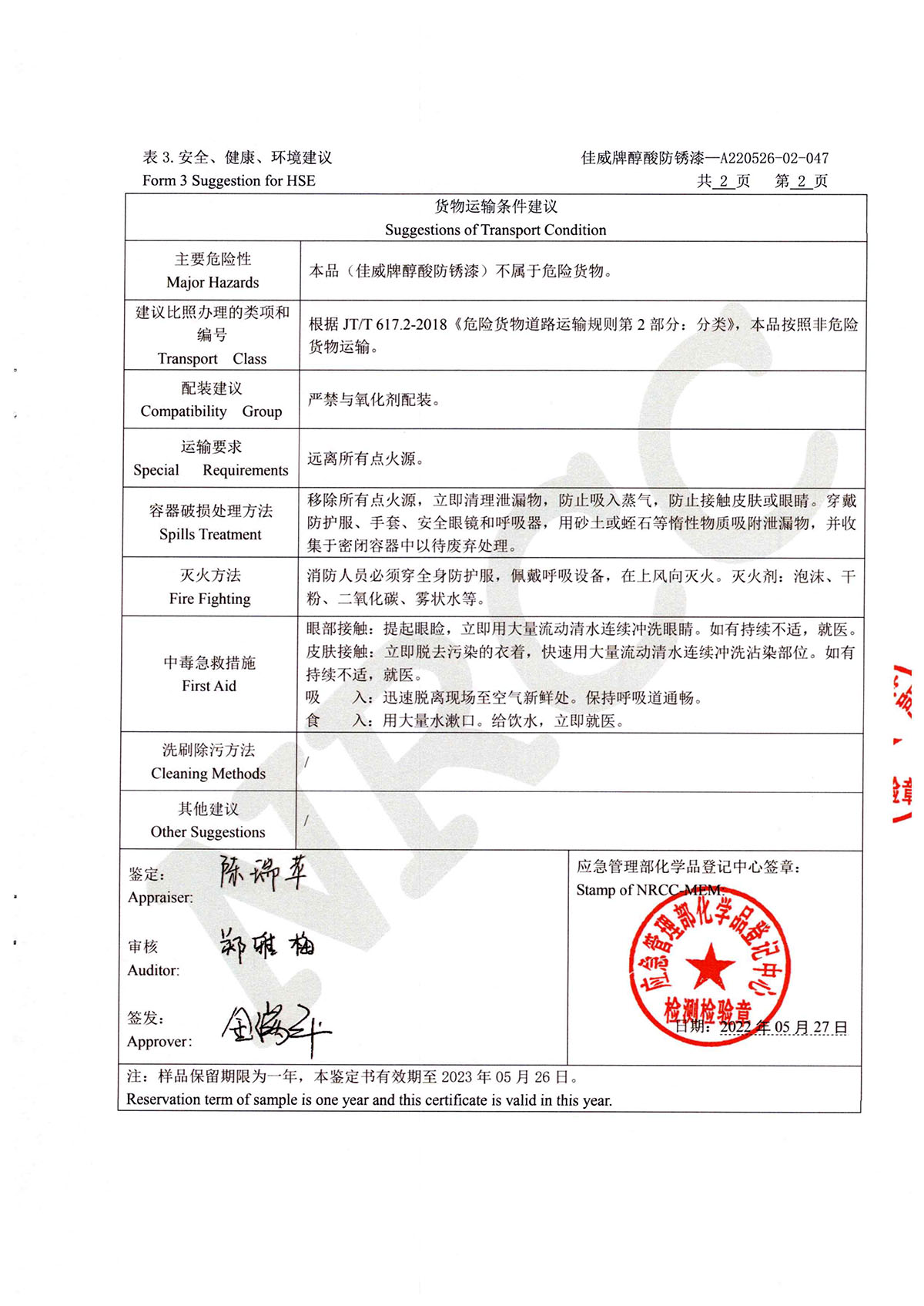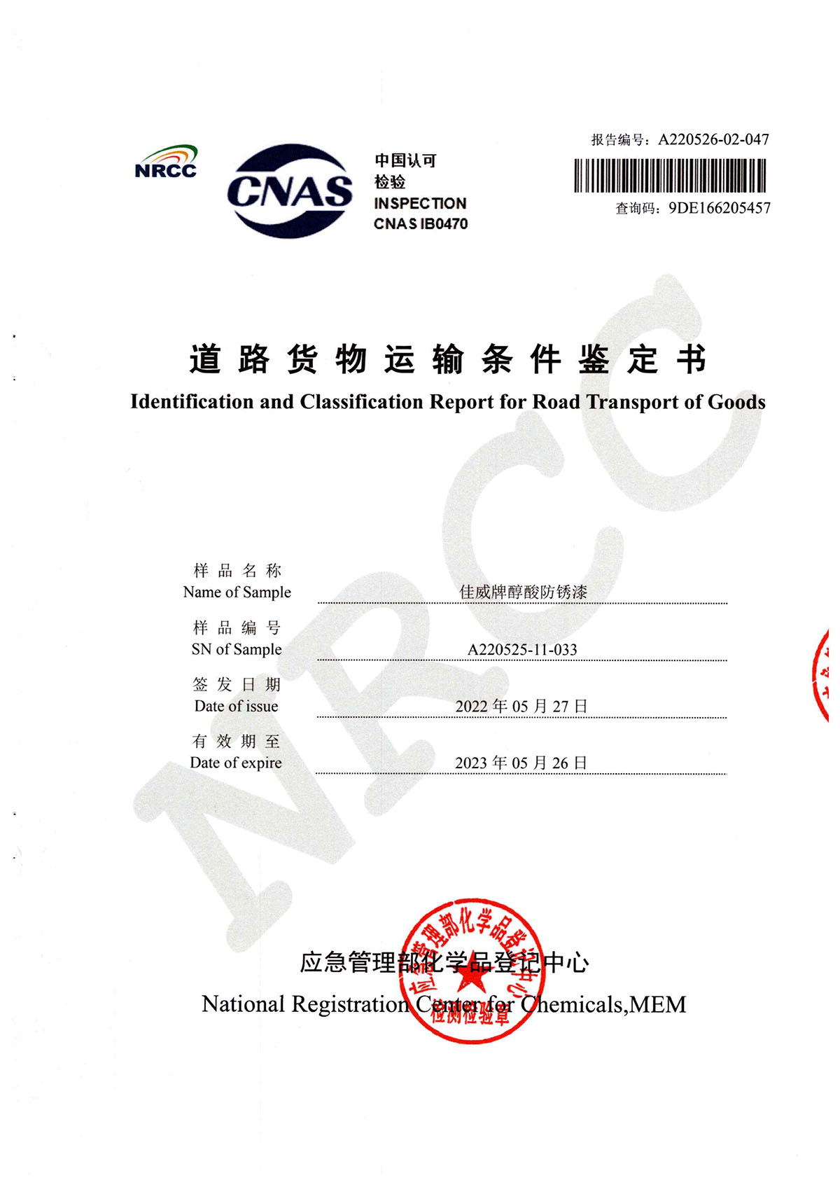 佳威醇酸防銹漆道路貨物運(yùn)輸鑒定書(shū)
