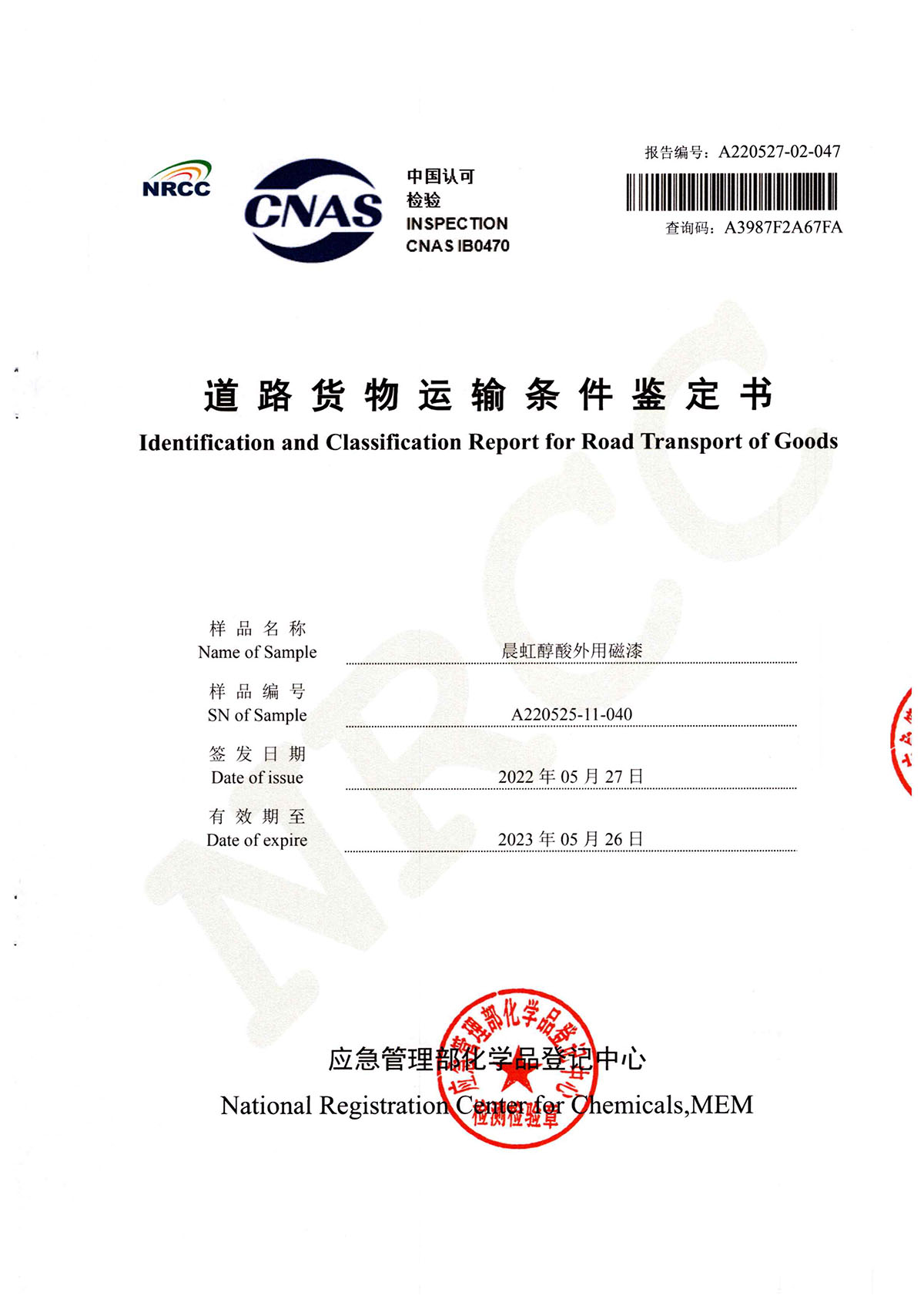 晨虹醇酸外用磁漆道路貨物運輸鑒定書